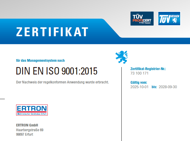 Am 12.09.2025 haben wir die Rezertifizierung nach ISO 9001:2015 erneut für weitere 3 Jahre erlangt